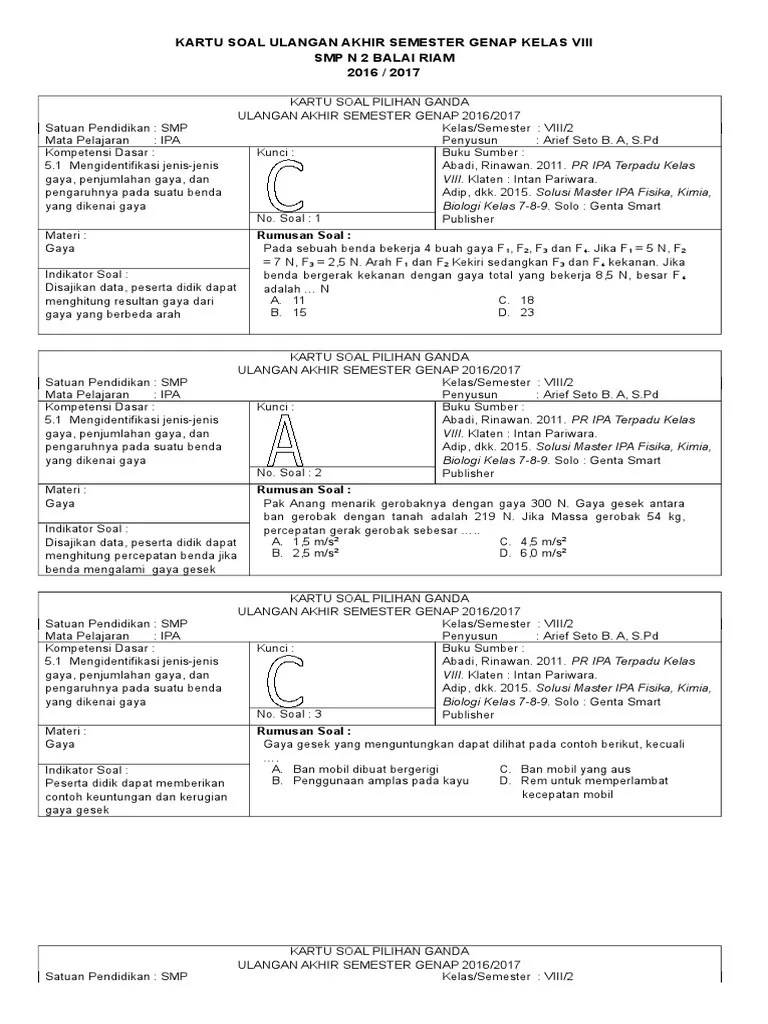 Berikut link yang dapat anda klik untuk men . Pilihlah jawaban yang paling tepat dengan memberi tanda silang (x) pada huruf ikhlas beramal kementrian agama kabupaten jepara ulangan tengah semester genap . Latihan soal ipa smp kelas 8 untuk menghadapi ulangan akhir semester (uas). Berikut adalah contoh soal ipa kelas 8 semester 2 bab 7 yang dapat kalian download file soal nya melalui link di bawah ini! Soal dari soal latihan uas mapel ipa (sains) kelas 8 smp / mts semester 1 dan 2 . Lingkungan dan makhluk hidup lain d. Latihan soal ipa ulangan akhir semester 2 kelas 8 smp mts ini untuk referensi belajar peserta didik kelas 8 smp, dalam menghadapi ulangan . 60 contoh soal ipa kelas 7 semester 1 2 beserta kunci jawaban. Dengan adanya soal dan kunci jawaban ipa kelas 8 semester 2 ini .